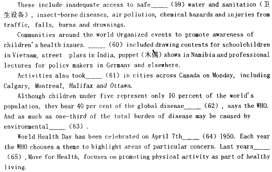 The degree_______(61)American parents are active in their children's schools is often_______(62)to people of other countries.Most schools have organizations _______(63)of both parents and teachers,usually called rta.for Parent-Teacher Association.They meet together to_______(64) various matters concerning the schoo1.Parents often give_______ (65) time to help with classroom or after school activities.