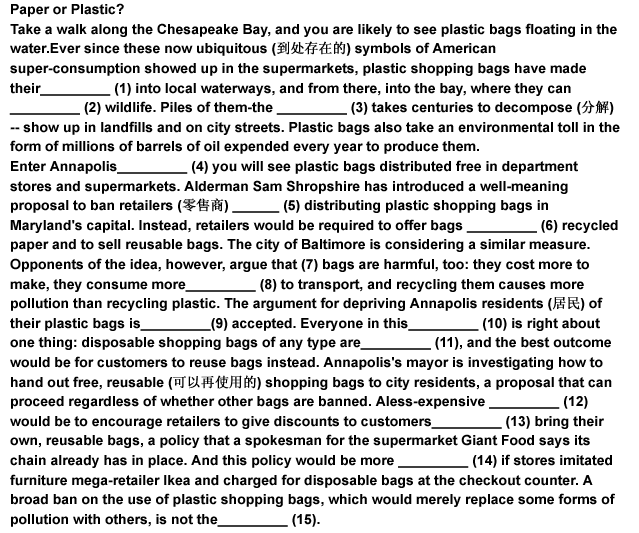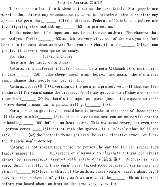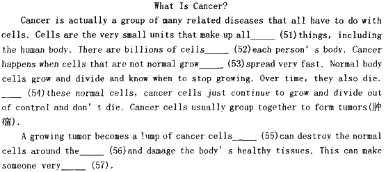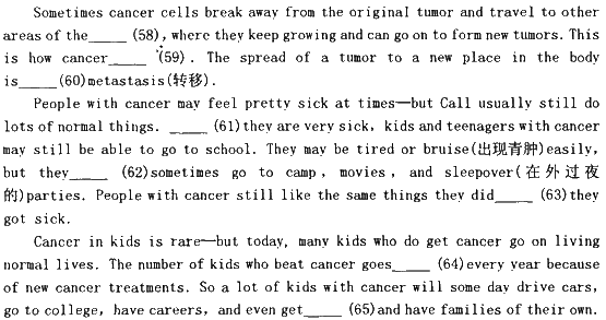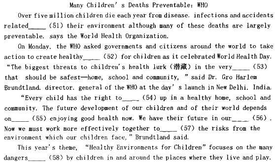 When there is free education available to all children in the United States,why do people_______(54)money on private schools? Americans offer_______(55) great variety of reasons for doing S0,including the desire of some parents to send their children to schools_______(56)classes tend to be smaller,or where religious instruction is included as part of to he educational program,or because,_______(57)their opinion。The public schools in their area are not_______(58) high enough quality to meet their needs.Private schools in the United States_______(59) widely in size.Quality, and in the kind of program that are offered to meet_______(60) of certain students.