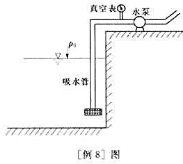 如[例8]图所示,水泵进口前的真空表测得真空度hv=5.78m水柱、试换算成相对压强与绝对压强(当地大气压强pa=100kN/m),