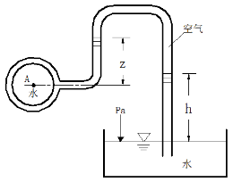 测量容器中A点压强的真空计如[例11]图所示.已知Z=1m,h=2m,当地大气压强p0=1bar(绝对压强),求A点的绝对压强、相对压强和真空度.