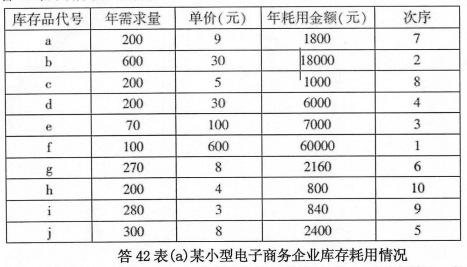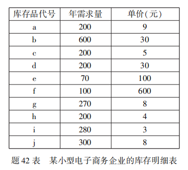 1、已知某小型电子商务企业拥有10 项库存品,各库存品的年需求量、价格如题42表所示。