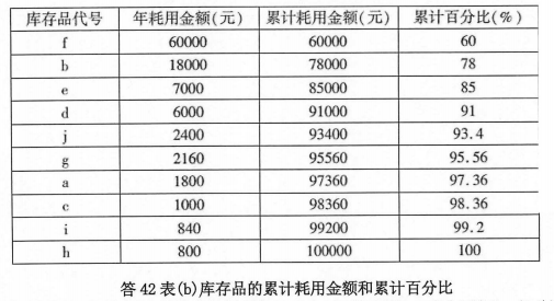 其次,计算各库存品的累计耗用金额和累计百分比,如答42表(b)所示(2分):