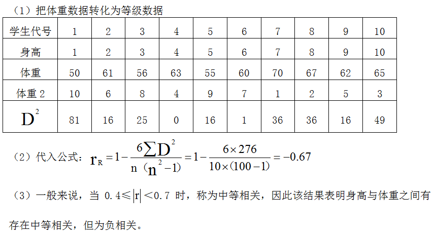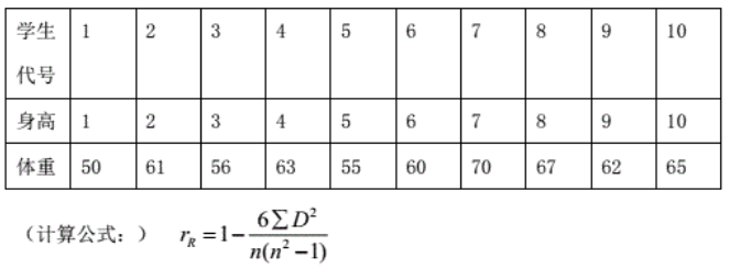 1、某位同学认为身高和体重存在密切关系,并抽样调查得到下列数据(身高从高到低排列,为等级数据,体重单位为千克),试计算二者的相关系数并判断其关系密切程度。(无需对计算所得的相关系数作假设检验,计算保留到小数点后两位数)