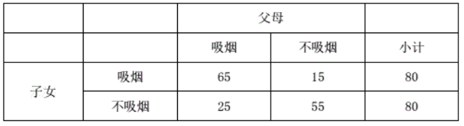 1、为了研究父母吸烟对子女吸烟是否有显著性影响,随机调查了160名青少年及其家长,数据如下表所示,试问:子女吸烟与父母吸烟之间是否存在某种联系(df=l,X20.05=3.84,结果保留到小数点后两位数)