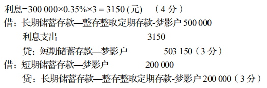 2、储户梦影于2012年3月10日来行存款50万元,她所选择的储种是整存整取定期储蓄存款5年期,年利率5.5%。但该储户于2015年3月10日部分提前支取30万元,其余续存。该储户存款时银行挂牌的活期存款利率为4.0%,支取日挂牌的活期存款利率为0.35%。试计息并转账。(10分)