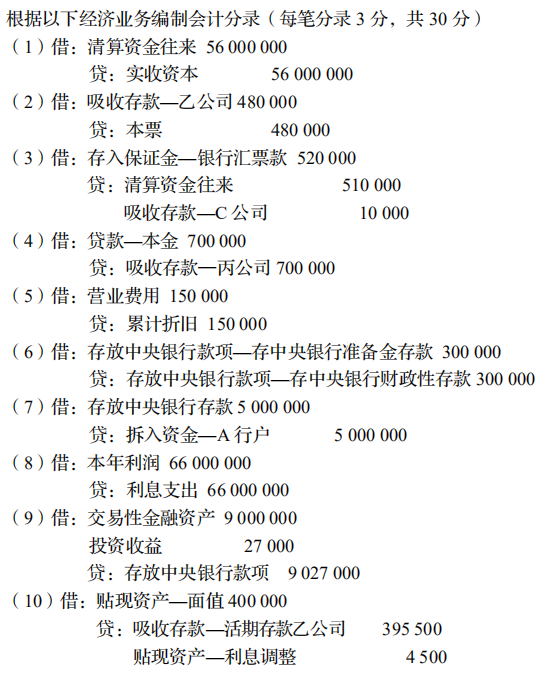 1、根据以下经济业务编制会计分录(每笔分录3分,共30分) (1)本行新成立时,甲公司(注:在他行开户)投入货币资金5600万元。 (2)开户单位乙公司提交“本票申请书”,要求签发不定额本票一张,金额为48万元。经审查后办理本票签发手续。 (3)收到系统内南京市分行某办事处的资金汇划信息,经审查是结清原对开户A单位签发的银行汇票(汇票金额为52万元,实际结算金额为51万元,多余款1万元)。经审查后立即入账。 (4)丙公司申请一笔70万元的半年期信用贷款,年利率5.66%。经审查借款凭证后立即入账。 (5)经计算本月应提取的固定资产折旧金额为15万元 (6)经计算,本旬应调减缴存中央银行-般性存款30万元,据有关凭证立即入账。 (7)本行向跨系统的A行借入资金500万元,当收到开户人行的收账通知和拆出行的借据回单时,办理转账。 (8)结转本月利息支出6600万元。 (9)本行购入5年期金融债券,总价为900万元,另付手续费2.7万元。该债券年利率4.8%,到期还本付息,本行不准备持有至到期,见机出售。 (10)本行同意受理其开户的乙公司提交的银行承兑汇票贴现申请。经审查该汇票尚有3个月到期,汇票面额为40万元,贴现利率为4.5%,完成相关账务处理。