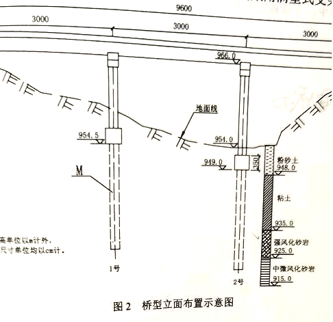 2、某施工单位承建了一段二级公路,其中1号桥梁起讫桩号为K30+500——K30+596,桥型立面布置示意图如图2所示,该桥为单向双室现浇预应力混凝土连续箱梁,下部结构为灌浇式桥墩,轻型桥台,桥梁纵坡为1%,2号墩承台尺寸为8×3.6×3.5m(横桥向×纵桥向×高)。地下水位高程为953.0m,上部结构采用满堂式支架现浇施工。