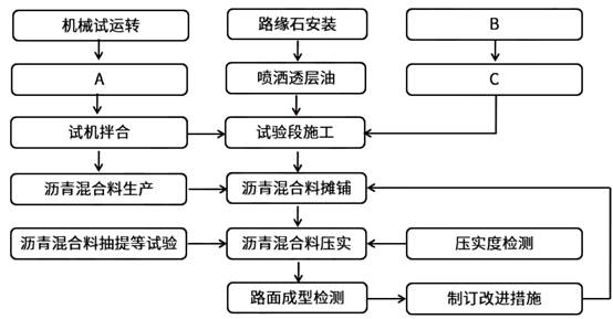 施工中发生以下事件: 事件一:施工单位喷洒透层油时,施工技术要求如下: (1)透层油采用沥青洒布车,按设计喷油量分两次均匀洒布 (2)透层油洒布后应不致流淌,应渗入基层一定深度,在表面形成油膜 (3)气温低于10℃或大风,即将降雨时,不得喷洒透层油。 (4)透层油洒后应待充分渗透,一股不少于24h后才能摊铺上层 (5)在进行下一道工序前,应将局部有多余的未渗入基层的透层油清除 事件二:施工单位通过试验段施工,确定了松铺系数、施工工艺,机械配备等指标,且通过沥青混合料马歇尔试验评价了沥青混合料在外力作用下抵抗变形的能力,抗塑性变形的能力等指标。 事件三:参与项目施工的施工机械设备种类和数量较多,施工单位对施工设备建立了管理台账,每台设备讲行了归档,主要归档内容如下: (1)设备的名称、类别、数量、统一编号。 (2)产品合格证及生产许可证(复印件及其他证明材料)。 (3)大、中型设备安装、拆卸方案》《施工设备验收单》及《安装验收报告》 问题 1.写出图3中工艺A、B、C的内容。(从“沥青混凝土配合比、配合比调试、批准配合比”中选择)