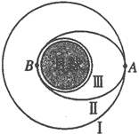 6、如图所示,在“嫦娥”探月工程中,设月球半径为R,月球表面的重力加速度为g0。飞船在半径 为4R的圆型轨道Ⅰ上运动,到达轨道的A点时点火变轨进入椭圆轨道Ⅱ,到达轨道的近月点B时,再 次点火进入近月轨道Ⅲ绕月做圆周运动,则( )。
