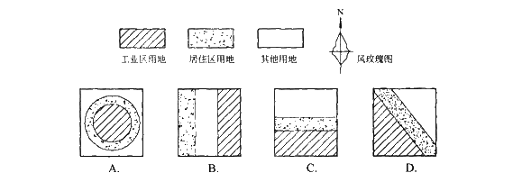 第 69 题 在下列风玫瑰图风频的影响下,哪种用地配置和风频玫瑰图相吻合?( )