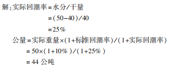 2、某厂出口生丝50公吨,双方约定标准回潮率是10%,用科学仪器抽出水分后,生丝净剩40公吨。请计算这批生丝的公量。