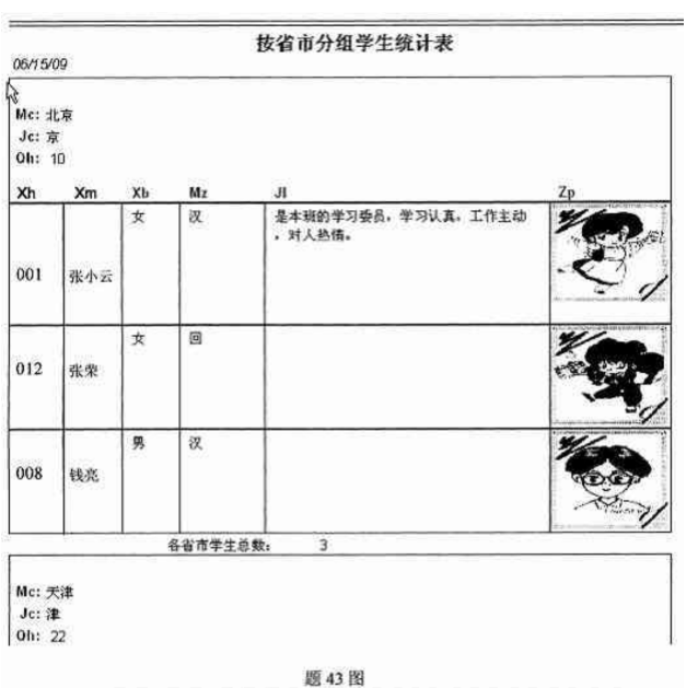 3、报表数据来源于STUDENT(学生)和SS(省市)两个数据表,可以按学生籍贯(JG)分省市显示和统计人数,下面是报表输出的形式: