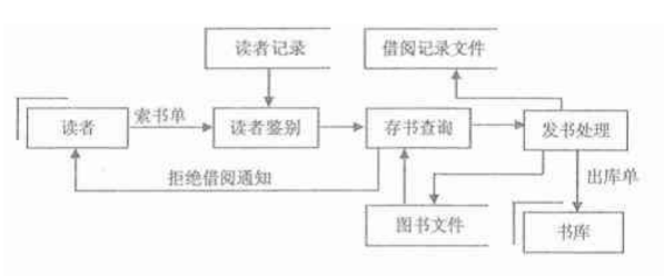 1、借书处理的过程是:接受读者提交的索书单,首先查看读者记录进行读者鉴别,再查询图书文件,进行存书查询;如果图书未借出,进行发书处理,存储借阅记录文件,并修改图书文件,再向书库发送出库单;如果图书已借出,向读者发送拒绝借阅通知。画出处理过程的数据流程图