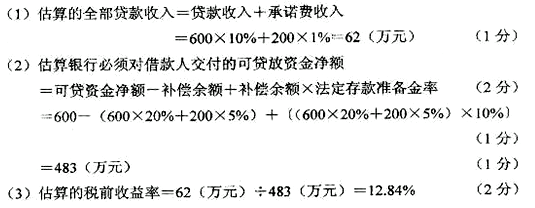 2、某银行客户申请800万元的信用额度,但实际按照合同规定的10%的利率使用了600万元,客户对其未使用的信用额度需支付1%的承诺费,而且银行要求客户应该有相当于实际贷款额的20%和未使用额5%的存款作为补偿余额,中央银行的法定存款准备金率假定为10%。试估算银行贷款的税前收益率(计算结果保留至小数点后2位)