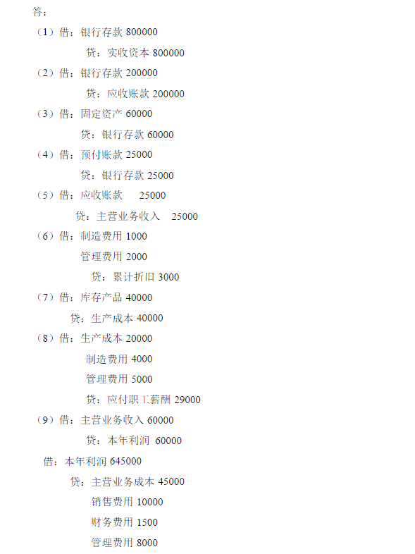 1、资料:2010年6月份H公司发生的部分业务如下: (1)收到出资人投入货币资金800000元存入银行。 (2)收回应收账款200000元存入银行。 (3)购入不需要安装的机器设备一台,价款60000元已用银行存款支付。 (4)用银行存款预付购料款25000元。 (5)赊销产品一批,价款25000元。 (6)计提固定资产折旧3000元,其中:车间设备计提2000元,行政办公设备计提1000元。 (7)结转完工产品成本40000元。 (8)分配本月应付的职工薪酬29000元,其中:生产工人薪酬20000元,车间管理人员薪酬4000元,行政管理人员薪酬5000元。 (9)结转本月实现的收入与发生的费用,其中:主营业务收入60000元,主营业务成本45000元,销售费用10000元,管理费用8000元,财务费用1500元。 要求:根据上述业务编制会计分录(不考虑增值税)