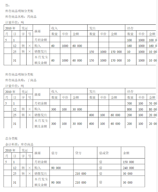 3、资料:2010年5月1日D公司“库存商品”总分类账期初余额150000元,其所属明细分类账记录如下:丙商品100吨、每吨1000元,共100000元;丁商品500件、每件100元,共50000元。5月份发生下列经济业务(不考虑增值税): (1)12日,购入丙商品60吨、每吨1000元;购入丁商品300件、每件100元。货款尚未支付,商品已验收入库。 (2)25日,销售丙商品150吨、丁商品600件。 上述业务的有关会计分录如下: (1)购入商品时: 借:库存商品——丙商品 60 000 ——丁商品 30 000 贷:应付账款 90 000 (2)确认收入的会计分录略。结转销售成本时: 借:主营业务成本 210 000 贷:库存商品——丙商品 150 000 ——丁商品 60 000 要求:根据上述资料对“库存商品”总分类账和所属明细分类账进行平行登记。