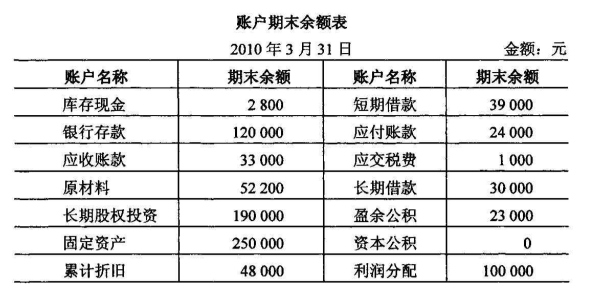 2、资料:2010年3月31日A公司资产、负债以及部分所有者权益类账户的期末余额如下表所示: