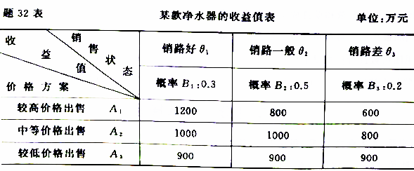 2、某企业计划生产某款净水器,拟定的价格有A1、A2、A3三个方案,预计进入市场后可能的销售状态有三种,收益值表如题32表所示,试以最大期望收益值决策标准作出该款净水器价格的决策选择