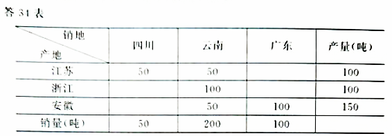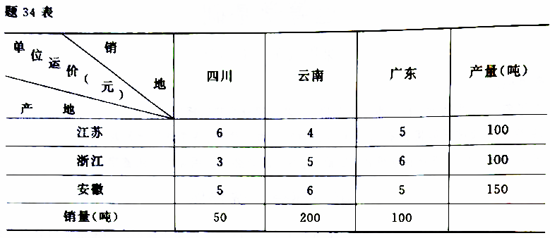 1、上海一家集团公司在江苏、浙江、安徽同时生产某化工原料,该原料销往四川、云南、广东,产量、销量及单位运价如题34表,试用西北角法求其最初运输方案及相应的总运输费用