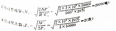 3、某工厂每年需要采购某种原料2000000元,每吨该原料采购单价为500元,已知每订购一次的订购费用是50000元,库存保管费用按年利率计算占平均存货额的20%,试求该企业最佳订货批量和全年最佳订货次数