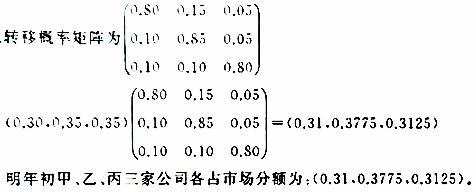 2、已知甲、乙、丙三家通讯网络公司对本地提供有线网络服务,今年初分别占有本地市场份额的30%、35%、35%。根据调查,今后甲公司保有其顾客的80%,丧失15%给乙,丧失5%给丙;乙公司保有其顾客的85%,丧失10%给甲,丧失5%给丙;丙公司保有其顾客的80%,丧失10%给甲,丧失10%给丙,试求明年初这三家公司各占多少市场份额