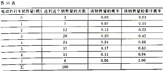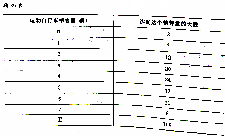 3、已知某款电动自行车在某城市过去100天内销售记录如题36表,试求每种可能的销售量值的概率,并求出累计概率