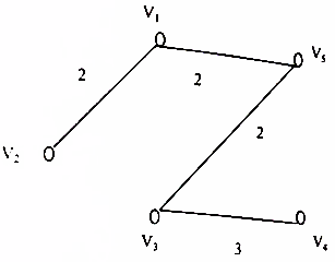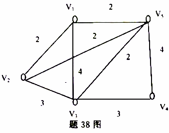 2、已知连接5个城市的通讯网络设计图如题38图所示,图中线边的数字表示拟建通讯网络的费用,现在要在这5个城市间铺设通讯网络,要求通讯网络的总费用最小,试画出铺设方案并求最小的通讯网络的总费用
