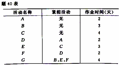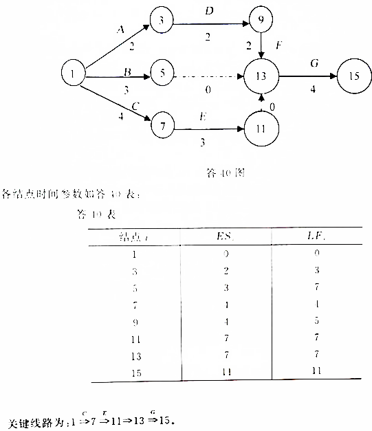 2、某一项工程有7项活动,有关数据如题40表,试绘制该工程的箭线式网络图,求出各结点的最早开始时间和最迟完成时间,写出关键线路