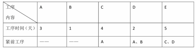 1、已知某项加工任务共有A、B、C、D、E五道工序,工序之间的关系及工序时间见下表:
