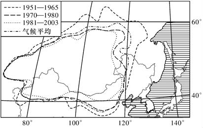 23、亚洲高压是冬半年盘踞于蒙古—西伯利亚地区对流层下部的稳定而强大的冷气团。气象学中一般用 1025hPa等压线作为其分布范围的标注线。下图为1951年以来亚洲高压的位置平均变动示意图。读图,完成下列各题。