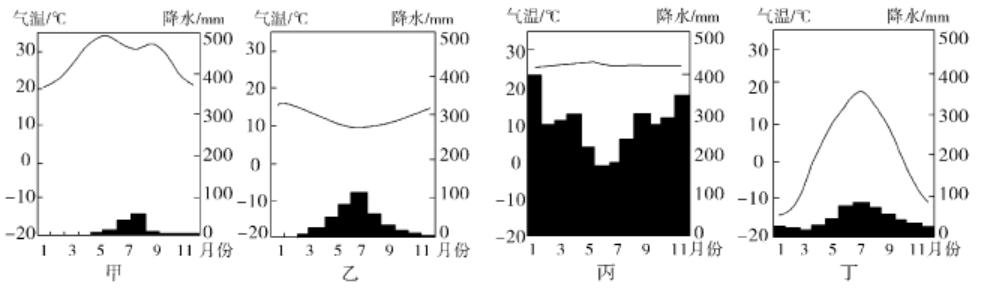 D.丁地气候类型仅分布在北半球