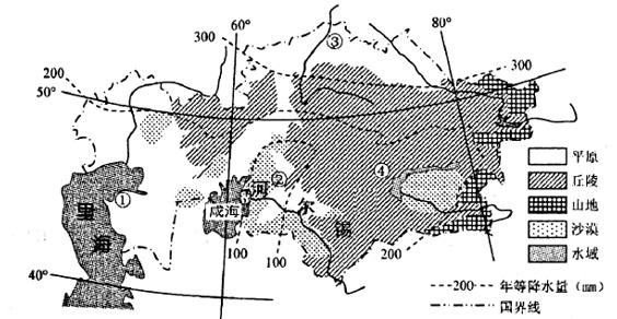 20、哈萨克斯坦大部分耕地种植春小麦,而锡尔河沿岸是重要的棉花基地。成海原为世界第四大湖,2014年成海大部分干涸,预计到2020年将完全消失。下图为哈萨克斯坦地形和年等降水量分布图。据此完成下面小题。