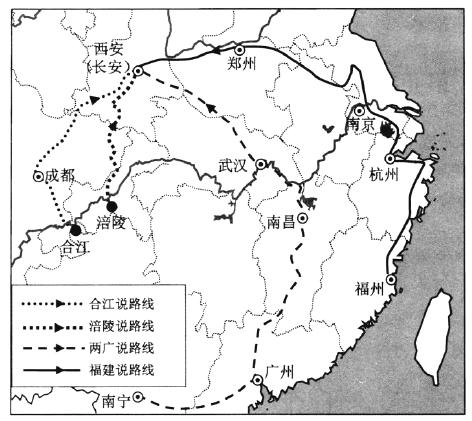1、白居易云:“若离本枝,一日色变,三日味变。别离支之名,又或取此义也。”“离支”后写成“荔 枝”。荔枝在我国主要分布于18°N-29°N,两广地区栽培最盛。杜牧诗云:“一骑红尘妃子笑,无人 知是荔枝来,”北方某中学地理小组研究杨贵妃所食荔枝来源,发现存在四种学说,下图为四种学说运 输路线图。据此完成下面小题。