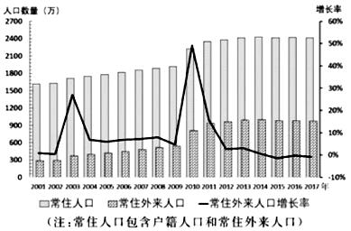 29、2014年上海市建设用地开发强度为46%,已超过东京、香港等国际大都市,“十三五”期间上海市将 “人口天花板”设定为2500万。下图为“2001-2017年上海市人口变化图”回答下面小题。