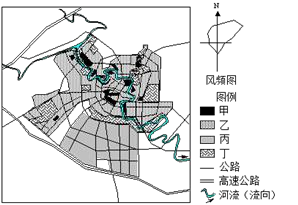 12、下图为山东省某县城2015~2020年城市总体规划示意图,甲、乙、丙、丁代表不同的城市功能区。 读图回答下面小题。