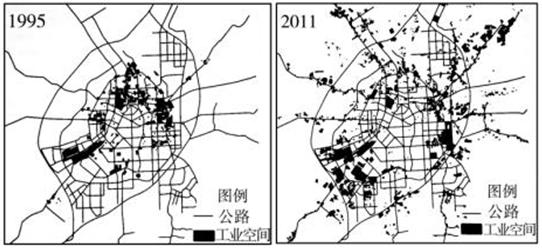 18、下图为1995年和2011年长春市工业空间分布图。读图,回答问题。