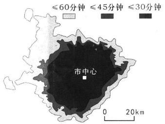 6、等时间交通图集成时间与空间两个维度,一般指从中心地出发,在单位时间内能够到达的空间范围。读我国某城市市内交通1小时交通圈示意图,回答下面小题。