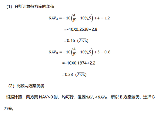 3、有两个方案A与B,投资额均为10万元,方案A的寿命为5年,年收益为4万元,年运行成本1.2万元;方案B的寿命期为8年,年收益为3万元,年运行成本0.8万元;若目标收益为10%,试用净年值法选择较优方案(保留小数点后两位)以下参数供计算时参考: (P/A, 10%,5) =3.791 (AVP, 10%,5) =0.2638 (A/F, 10%, 5) =0.1638 (F/A, 10%,5) =6.105 (P/A, 10%,8) =5.335 (A/P, 10%,8) =0.1874 (F/A,10%,8) =11.436 (A/F, 10%,8) =0.087
