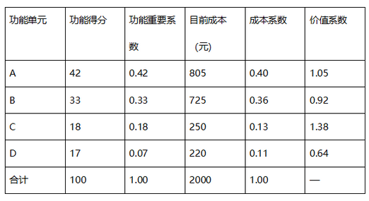 1、某产品由A、B、C、D四个功能单元组成,其目前成本本别为805元、725元、250元和220元,各功能单元的功能得分为42分、33分、18分和7分。已知各零部件单元的功能与成本基本匹配,其成本没有降低的可能性。 请计算出各个零部件的功能重要性系数、成本系数及价值系数。