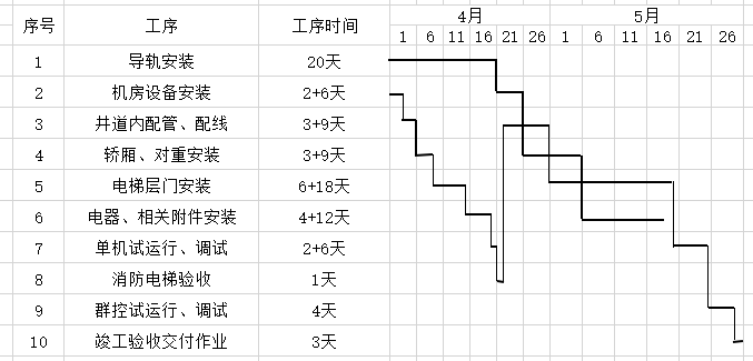 4、案例四 背景资料某安装公司承接一项公共建筑的电梯安装工程,工程有28层,28站曳引式电梯8台,工期为90天,开工日期3月18日,其中2台消防电梯需在4月30日前交付,在通过消防验收后,作为施工电梯使用.电梯井道的脚手架工程、机房及厅门预留孔的安全防护设施由建筑上柱公司实施,验收合格。安装公司项目部编制了电梯施工方案,书面告知了工程所在地的特种设备安全监督管理部门,工程按期开工,电梯施工进度计划见表3。电梯安装采用流水搭接平行施工,电梯安装前,项目部对机房和井道进行交接检验,均符合电梯安装要求,工程按施工进度计划实施,电梯验收合格,交付业主。问题: 1.电梯安装前,项目部在书面告知时应提交哪些材料? 2.厅门预留孔安全防护装置的设置有什么要求? 3.消防电梯从开工到验收合格用了多少天?电梯安装工期比合同工期提前了多少天? 4.电梯运行实验时,运行载荷和运行次数(时间)各有哪些规定?