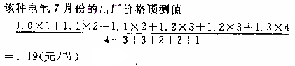 1、某乡镇企业试制成功一种5号电池,已知前6个月出厂价格顺序为:1.0,1.1,1.1,1.2,1.2,1.3(元/节),为了加大与预测期较近的实际数据的权数,该厂确定了相应的权数分别为:1,2,2,3,3,4,试依据加权平均数预测法,计算该种电池7月份的出厂价格预测值(结果保留2位小数)