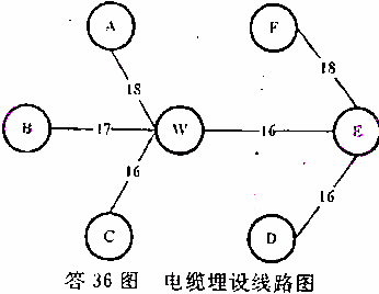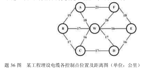 3、某工程埋设电缆,将中央控制室W与6个控制点相连通,各控制点位置及距离如下图:如何埋设可使电缆总长最短?求出最短距离。