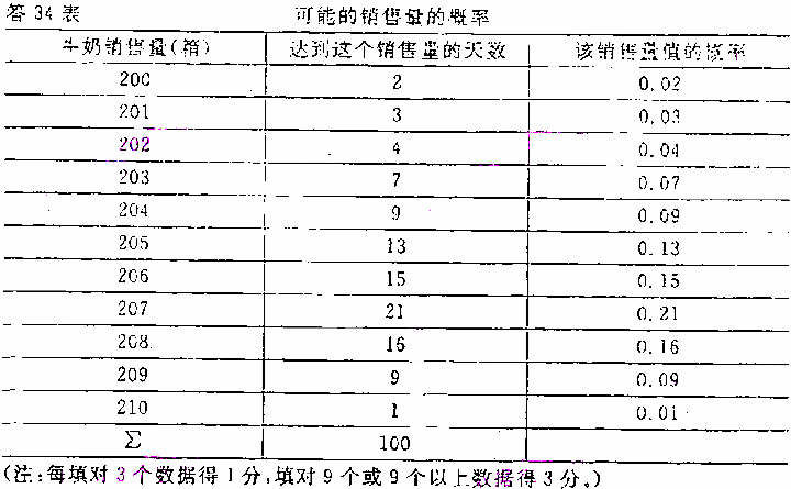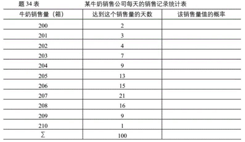 1、某牛奶销售公司收集了过去每天的销售记录列于题34表,销售记录表明,该公司销售量随机变动在每天销售200到210箱之间。试确定每种可能的销售量值的概率填在题34表中,并画出销售量的概率分布图