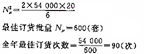 3、某设备公司每年按单价25元购入54000套配件。单位库存维持费为每套6元,每次订货费为20元。试求该公司最佳订货批量和全年最佳订货次数
