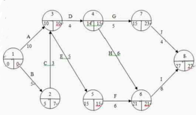 2、在你为题37所绘制的网络图上标出各结点时间参数;确定关键路线并用双线(或粗黑线)表示,计算总工期和J活动最早完成时间