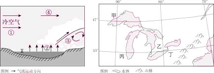 25、大湖效应是指冷空气遇到大面积未结冰的水面(通常是湖泊),从中得到水蒸气和热能,然后在向风的湖岸形成降水的现象。受大湖效应影响,2014年美国部分地区遭受罕见的暴风雪。下图左图为某次暴风雪形成过程示意图,下图为某区域地图。读图,完成下面小题。