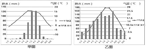 13、甲乙两图分别表示我国北纬30度附近两个省会城市年内各月气温与降水量柱状图。据此完成下列各题。