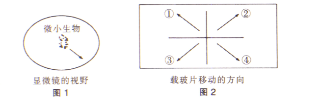 10、某同学用显微镜观察水中微小生物,图1中的箭头表示显微镜视野中微小生物的游走方向,为了不使该生物从视野中消失,则载玻片的移动方向(图2)是()。