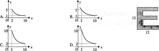 3、一张正方形的纸片,剪去两个一样的小矩形得到一个“E”图案,如图所示,设小矩形的长、宽分别为x,y,剪去部分的面积为20,若2≤x≤10,则y与x的函数图象是( )。
