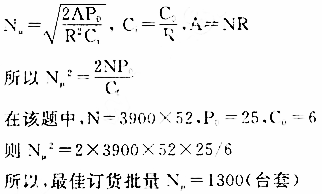 3、某公司平均每周需求某配件3900台套,每台套存贮一年费用为6元,每次订货费25元,试求该公司年度最佳订货批量和全年最佳订货次数。(每年按52周计算)
